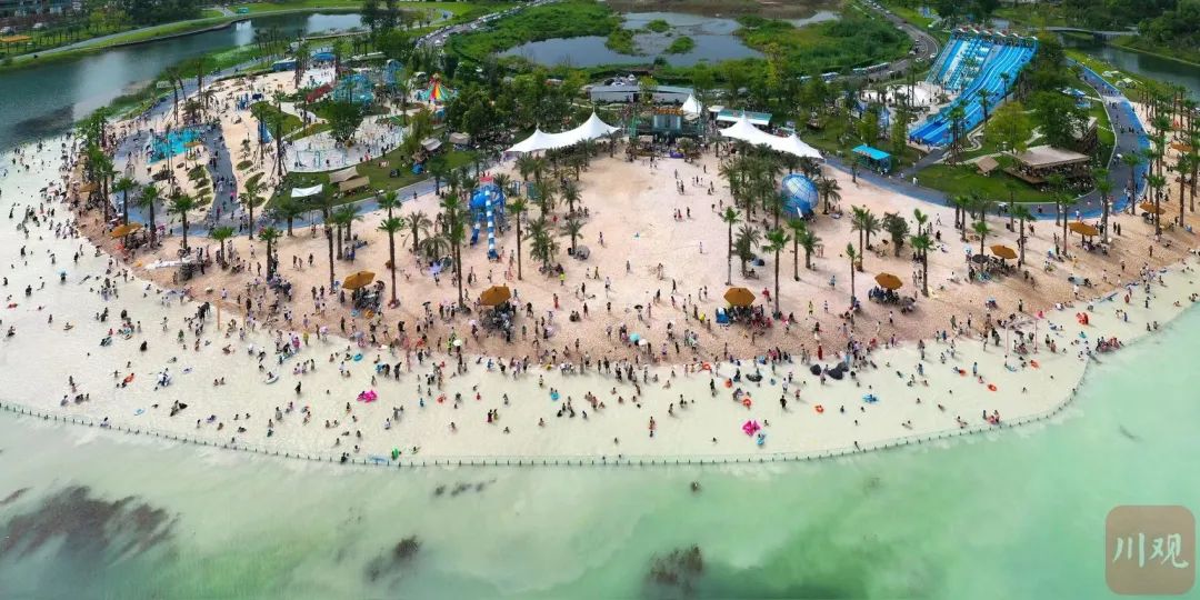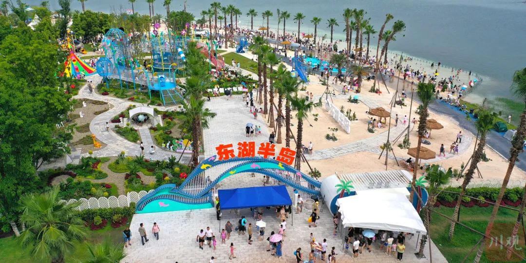 据了解,东湖半岛海滩乐园占地约90亩,总投资约2000万元。项目利用永盛湖环湖空间建成陆地休闲区和水上运动区两大板块,植入儿童游乐、亲水休闲、便民服务等业态,提供休息座椅、旅游厕所、驿站等配套设施,打造出以亲子家庭周边游为主的全年龄段消费场景,进一步丰富了遂宁市河东新区旅游产品,为市民游客提供一个城市近郊游、亲子游的新选择。