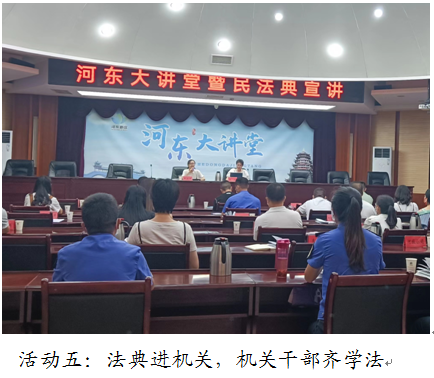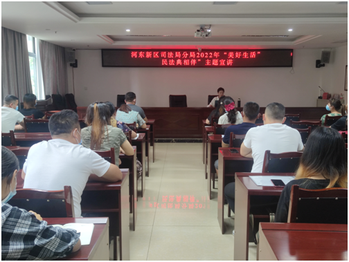5月31日,由党群工作部主办,司法分局承办第二期河东大讲堂。此次大讲堂,司法分局邀请新区法律顾问朱湘律师以民法典宣讲为主题,为新区机关干部进行普法宣讲。朱律师以“张小花年年岁岁的那些事”为主线,以案释法,对张小花一生中涉及的民事权利、婚姻家庭、侵权责任、继承等相关条款进行了解读,并现场解答了参会人员的法律问题。活动结束后,司法分局为参会人员赠送《民法典100问》50余本,发放《民法典》宣传折页100余份。