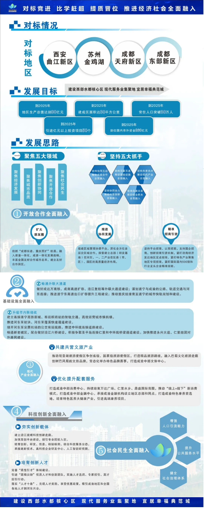 我们将抢抓成渝地区双城经济圈建设契机,加快经济社会全面融入步伐,锚定“五大”突破方向,撸起袖子加油干。一是推动开放合作全面融入。高水平做好对外开放合作,多维度推动极核区和市域内区县协同发展,深层次推动投资促进共赢。二是推动基础设施全面融入。加快提升市外外联大通道,丰富与市内区县联络线。三是推动现代产业全面融入。结合新区服务业发展优势,探索与周边地区共建共营文旅产业,积极优化提升配套服务。四是推动科技创新全面融入。稳步夯实科技创新载体,加快培育科技创新人才。五是推动社会民生全面融入。积极增强人口引流能力,加快推动公共服务水平共同提升,健全完善社会治理体系等。力争到2025年,经济发展实现更大跃升,地区生产总值达到80亿元,新区城市发展竞争力、影响力、吸附力达到成渝地区一流水平。