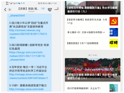 一是“线上”宣。自2月党史学习教育启动以来,利用街道官方微信公众号开辟《党史百年·天天读》专栏,现已刊发党史学习内容37期,阅读转发5300余条次;利用144个居民微信群、工作群等,转发上级关于党史学习教育安排80余条次,形成了“线上内容齐开花,党员群众随时学”的良好氛围,使广大党员群众知政策、明道理,增强了文化素养和文学修养。