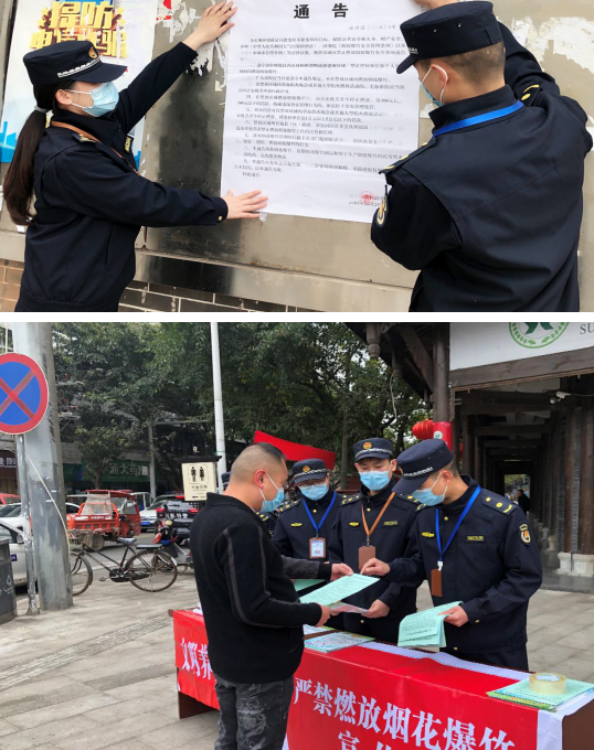 二、强化宣传,营造氛围。组织精干执法力量,通过张贴“禁燃”通告、发放《禁燃烟花爆竹倡议书》、执法车辆沿街进行音频宣传、在人流量众多的商场、市场周边设置禁燃禁放宣传点等形式,宣传烟花爆竹燃放造成的危害,普及相关法律法规,力争把禁燃要求转化为广大市民的自觉行动。
