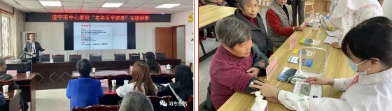 授牌仪式后,遂宁市中心医院老年医学科副主任侯斌为大家作了老年医学健康专题讲座。同一时间,遂宁市中心医院老年医学志愿队在小康小区党群邻里驿站开展了老年健康检测义诊活动。