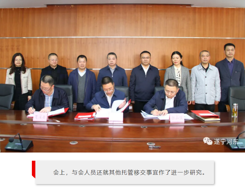 11月12日下午,吉祥组团托管、移交签约仪式在市环岛商务中心举行。签约现场,船山区政府、蓬溪县政府与市河东新区管委会签订了《托管行政移交书》。副市长雷云出席签约仪式。