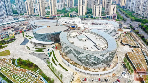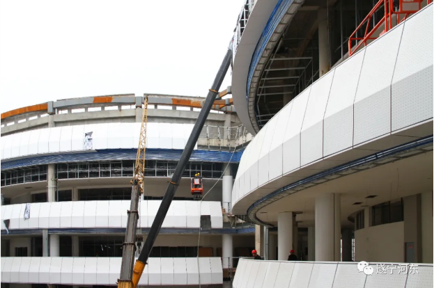 在市民中心项目建设现场,工人们正在抓紧施工。目前,形似五朵花瓣的遂宁市民中心已全面进入内外装饰及室外景观施工的“冲刺”阶段。