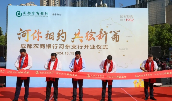 当天上午10时,成都农商银行河东支行经过精心筹备,在市河东新区五彩之心隆重举行开业仪式。市河东新区党工委副书记、管委会主任张宽,市河东新区党工委委员、管委会副主任张志敏,遂宁兴业投资集团总经理石镇槐,成都农商银行遂宁分行行长王继东出席仪式并剪彩,市河东新区有关部门负责人,企业代表及社会各界人士出席开业仪式。