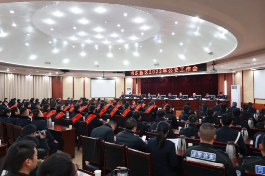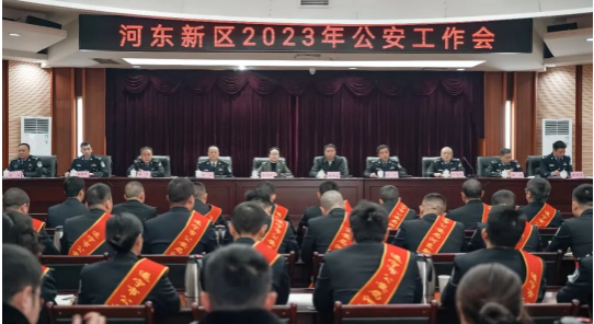 2月10日,河东新区召开2023年公安工作会议。会议坚持以习近平新时代中国特色社会主义思想为指导,全面学习贯彻党的二十大精神,深入学习贯彻落实全国公安厅(局)长会议、全省公安局(处)长会议、全市公安局长会议等系列会议精神,总结回顾2022年公安工作,深入分析面临形势,全面部署今年任务。河东新区党工委书记夏海荣,党工委副书记唐钰玺,管委会副主任、公安分局局长全新出席会议。分局党委成员、全体民警及辅警代表参加会议。会议由分局政委向辉主持。