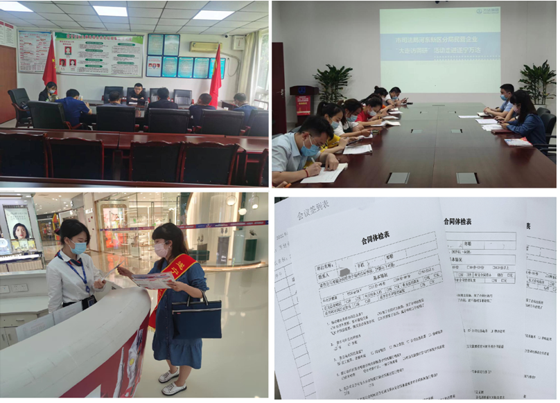为巩固深化政法队伍教育整顿和“我为群众办实事”工作成果,更好地推进法治河东建设,今年5月以来,河东司法分局以“法治体检”为载体,结合民营(外来)企业“大走访大调研”工作,深入辖区街道社区、万达商圈、民营企业走访,全面扎实开展政法系统大走访活动。一是高度重视,全面参与。召开“河东新区政法系统大走访专题会”,提前谋划、制定方案、拟定清单,成立走访工作组,明确走访方式、参与人员、走访对象和走访内容,加强走访的针对性和精准性,确保大走访活动有效推进。二是深入一线,全面走访。工作人员采取现场走访、问卷调查、调研座谈等方式,深入万达商圈、民营企业以及社区矫正人员,了解其在生产经营、日常生活中存在的法律困难,听取在健全法治营商环境、提升法治化水平以及进一步完善社区矫正工作等方面的意见建议。活动中,走访企业20余家,社区矫正对象6个,填写问卷调查、走访登记表各20余份,收集意见建议15条。三是结合职责,全面宣传。走访中,工作人员详细排查企业和社区矫正对象的法律服务需求,深入宣传《民法典》《优化营商环境条例》《社区矫正法》等相关法律法规和政策,走访万达商圈商铺50余个,发放法律服务卡100张,《民法典》宣传折页200余份,普查劳动合同60余份。