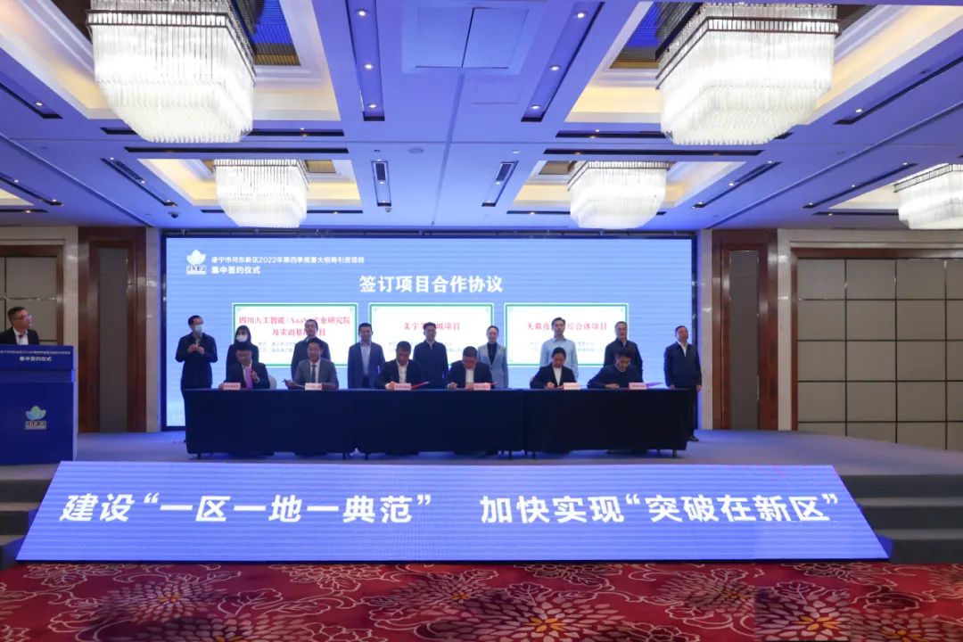 11月16日,市河东新区举行2022年第四季度重大招商引资项目集中签约仪式。副市长张韬,青岛海之晨工业装备有限公司董事长陈栋,四川省美宁实业集团清真食品有限公司董事长兼总经理唐和林,遂宁川地蜀南酒店管理有限公司总经理王明辉,市河东新区党工委书记夏海荣,市委宣传部副部长、市文化广电旅游局局长魏毅,市商务局党组书记、局长白争春,市河东新区党工委副书记、管委会主任杨东,市经济和信息化局党组成员、副局长谭止戈出席签约仪式,市河东新区党工委副书记杨明主持签约仪式。
