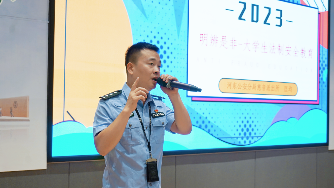 9月19日上午,河东公安慈音派出所民警张小龙、匡均来到四川师范大学遂宁校区为大一新生做法制安全教育讲座。