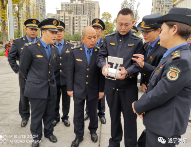 紧接着展示的是新区综合行政执法局购置的组装快、功能多、时速最高可达72km/h、飞行高度可达500米的无人机,这种无人机可执行空中悬停定点监控、拍摄等任务,在高空监察时不受空间和地形制约,响应速度快、在短时间内可实现大范围区域监察的优势,采集到的图像资料全面、及时、准确,初步实现了“空中城管”。