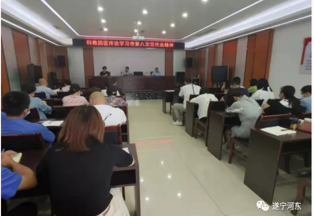 8月31日,市河东新区科教园在一楼会议室组织召开专题会议,传达学习市第八次党代会精神,共50名干部职工参与会议学习。