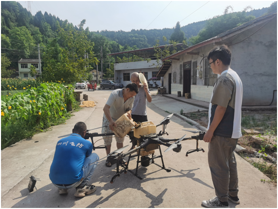 在锦秀村的一处连片稻田旁,工作人员首先将调配好的农药装入即将进行喷药作业的无人机内,然后作业员熟练地操作着无人机平稳起飞,来回盘旋于稻田间,农药随着无人机旋翼下的雾流均匀喷洒到水稻上。
