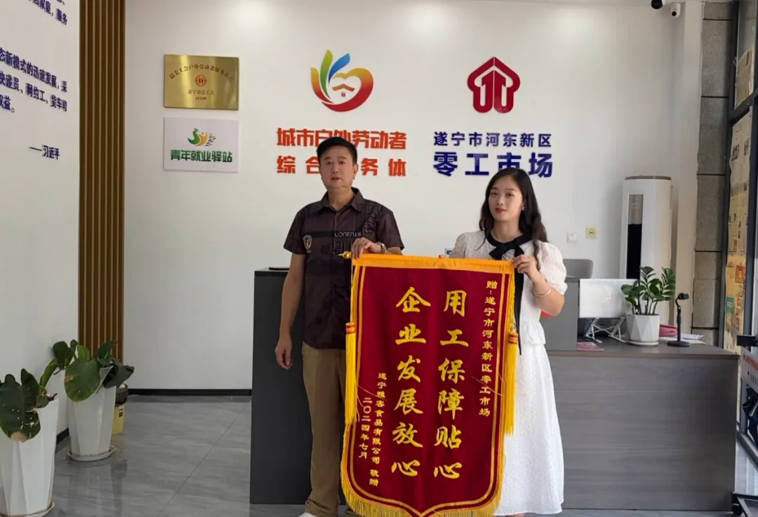 近日,雅客食品负责人手持“用工保障贴心,企业发展放心”红色锦旗走进河东新区零工市场,对7月25日零工市场助力企业用工,解决企业临时用工难、用工急的倾心服务表示衷心感谢。
