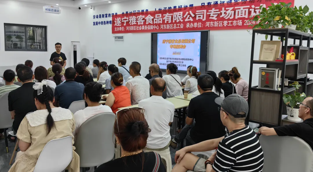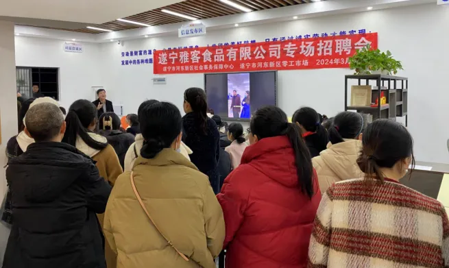 遂宁市雅客食品有限公司主要生产各类蛋糕、饼干、粽子、月饼快消食品。因端午、中秋需急招临时工的实际情况,新区社会事务保障中心在对接街道和零工市场掌握生产经营情况后,专门指导零工市场对雅客食品因阶段性用工量较大情况,先后在今年3月、7月份分别组织两场粽子工、月饼制作工的专场招聘会,共计560余人参会,达成就业意向114名,签订劳务合同76份。第一时间缓解企业用工难和用工急问题,有力保障企业订单及时交付,有效促进辖区居民稳定增收。▲雅客食品3月招聘会现场