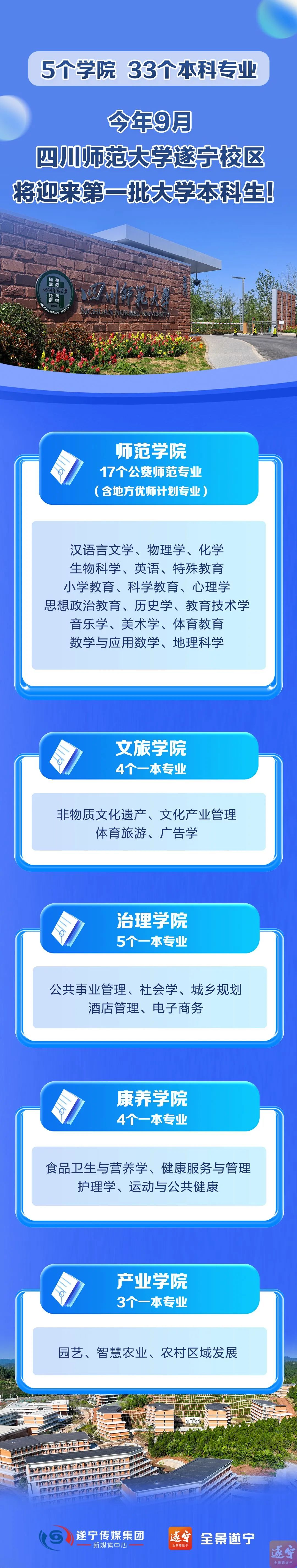 根据方案,四川师范大学遂宁校区将设5个学院,分别为师范学院、文旅学院、治理学院、康养学院、产业学院,初步规划设置33个本科专业。