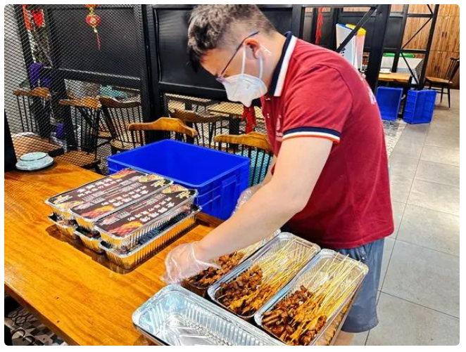 4月9日14:00,黄记猪牛羊全鲜烧烤店的厨房内,店员们正在切菜、腌料、穿串,忙得热火朝天,他们要准备3000余串共120盒烧烤,送往康城国际、奥城花园等各小区防疫点。4月8日以来,他们每晚为奋战在防疫一线的社区工作人员和志愿者免费提供夜宵和饮料。“我们尽量多准备一些菜品,蒜香五花肉、羊肉串、蒜香排骨、牛肉串等十余个全鲜种类,想让一线的防疫人员吃得可口!” 黄记猪牛羊全鲜烧烤店负责人黄涛告诉记者,疫情原因致使店内人手不足,每天下午他和几名员工备菜,晚上8点开始烤制,再配送到各防疫点。