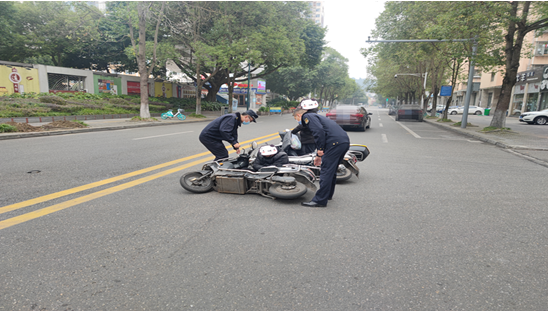 考虑到人员安危和路面情况,工作人员赵明华、邓全立刻上前伸出援手,两人合力将电动车辆停放至路边,并搀扶起摔倒在地的驾驶员。虽然两车相撞,但好在情况并不严重,驾驶员也只是轻微擦伤。在确认人员无恙的情况下,工作人员赵明华、邓全才转身投入到城市管理日常巡察之中。