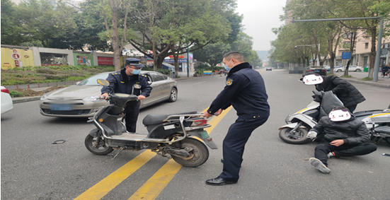 近日,河东新区综合行政执法局一大队工作人员赵明华、邓全在巡查至紫竹路时,突然听到一阵急促的刹车声和猛烈的撞击声,随后便发现两辆电动车相撞,驾驶员摔倒在地。