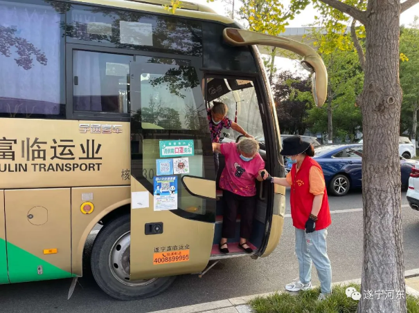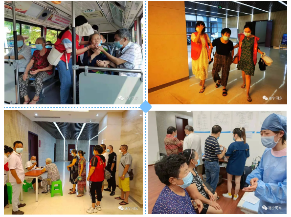 早上9点30分,慈音街道的张阿姨乘坐着河东新区疫苗接种专车抵达了河东体育中心。防疫工作者们全程跟随为接种群众做好全流程服务。