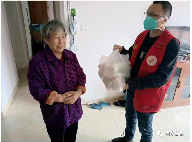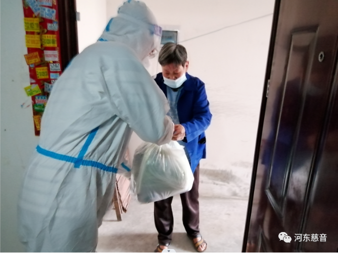 在疫情防控期间,慈音寺社区工作人员、志愿者走访辖区独居老人、孤寡老人,为他们送去蔬菜、鸡蛋、牛奶、口罩、消毒液等疫情期间日常生活必需品,并耐心讲解口罩、消毒液的使用方法。