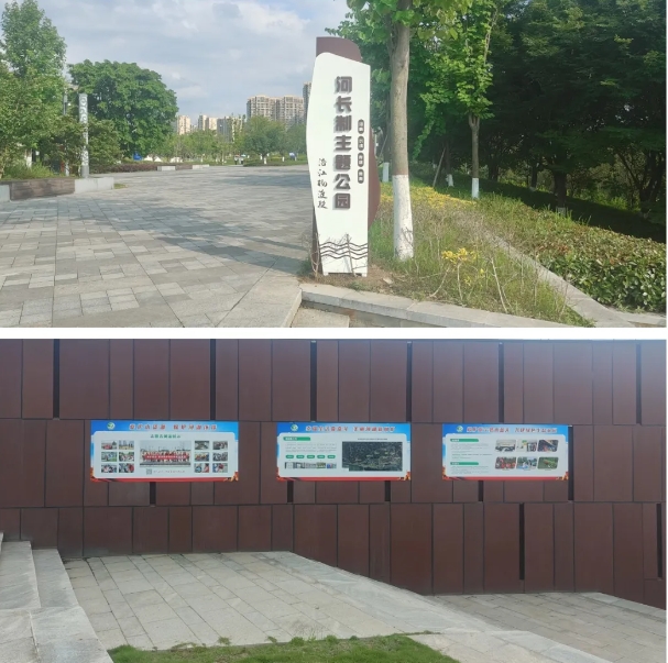 在遂宁市文化中心附近新建的河长制主题公园及相关宣传栏