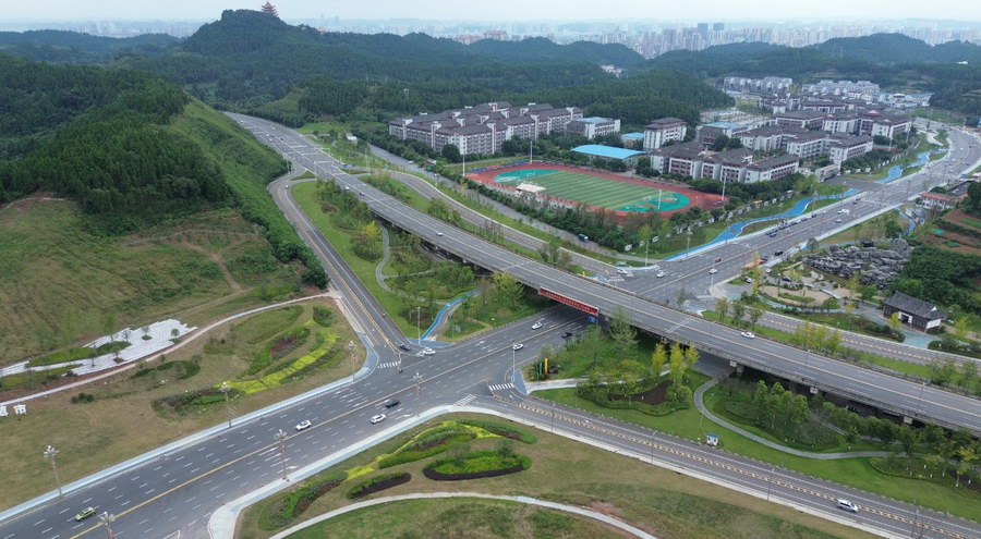 据了解,灵泉大道景观提升项目对国道318线至G93成渝环线高速遂宁东收费站沿线约2.8公里道路进行扩宽,路面由24米扩宽至31米,同时道路景观绿化、铺装、给排水、景观照明、标识系统、服务配套用房、挡墙及智慧城市设施进行了全面升级改造。景观绿化提升面积约21.65万平方米,山体植物恢复面积约3.43万平方米。