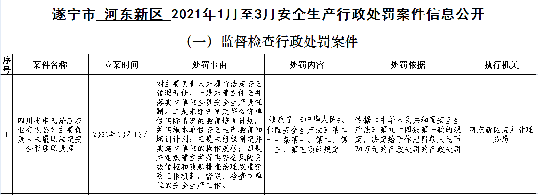 遂宁市河东新区2021年1月至3月安全生产行政处罚案件信息公开