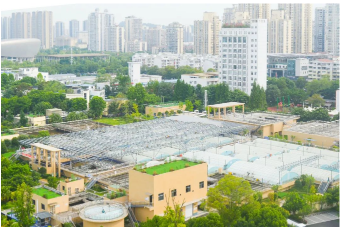 “项目建成既能美化工厂外观,又能实现经济和社会效益双赢。”中鹏水务公司相关负责人介绍,污水处理厂第五立面改造坚持绿色导向,铺设8600平方米光伏组件,年发电量可达100万度,实现第五立面改造与碳达峰碳中和有机结合。此外,在屋顶绿化中引入中水回用的理念,有效节约水资源。