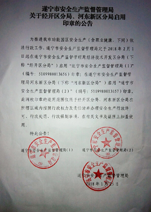遂宁市安全生产监督管理局关于经开区分局、河东新区分局启动印章的公告