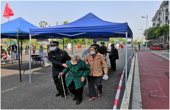 “现在正在进行采集核酸点位的消杀工作,请大家安心等待,等通知到相关楼层的时候再下楼,并依次排队,保持间隔距离。”“老大爷,您慢慢走,不着急,我们的工作人员护送你过去。”“没有智能手机可以用身份证登记,不用担心,有什么困难都可以告诉我们的工作人员,我们来想办法。”...城管队员们无时无刻不为身边的群众考虑,关注每个细节,在各自的岗位上,耐心解惑答疑,主动积极服务,彰显出严密防疫中这座城市“守卫者”的温情。