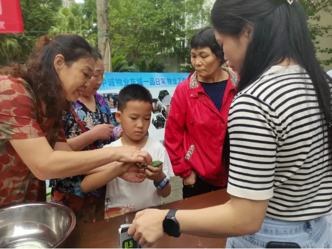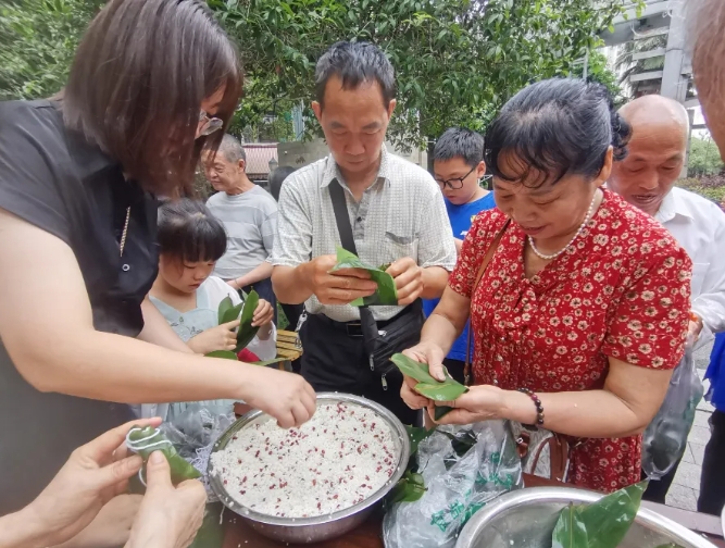 活动现场,青翠欲滴的粽叶、洁白饱满的糯米有序摆放在广场上。捋叶、填米、压实、扎绳……参与包棕子活动的业主们有的技法娴熟、手脚麻利、你追我赶,有的一边捋叶,一边向旁边的“高手”请教。