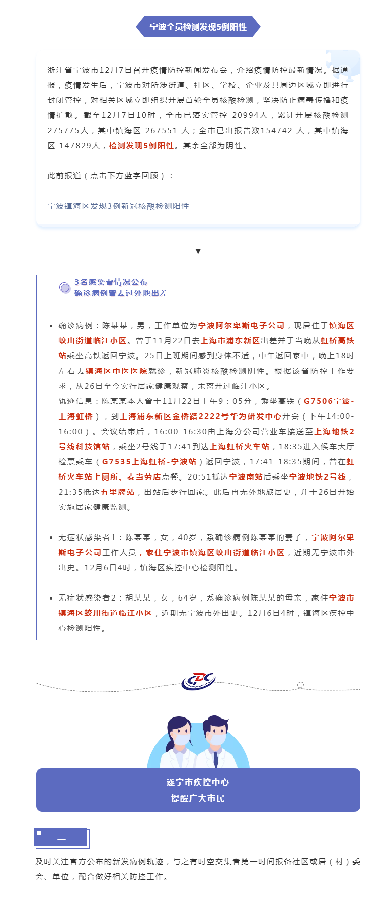 遂宁疾控紧急提醒:宁波相关区域全员核酸检测发现5例阳性,有以下情况速报备