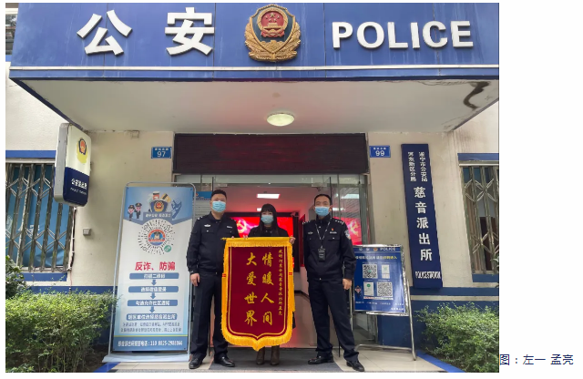 近日,一位女士拿着两面写有“情暖人间、大爱世界”“警民鱼水情、保人民之安”的锦旗来到慈音派出所,向民警孟亮表达诚挚的谢意。