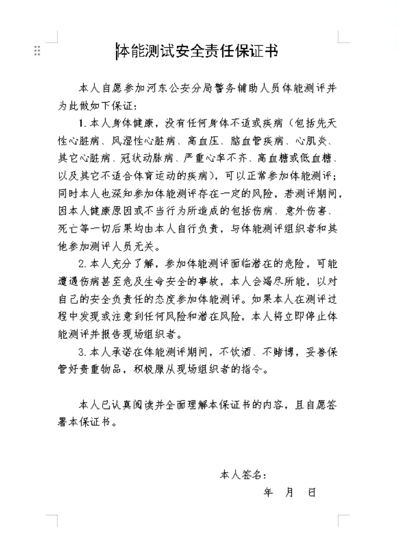 经资格初审合格后参加笔试、面试,所有参加了面试的人员均进行体能测评。笔试、面试、体能测评的时间地点以通知为准。参加体能测评人员应根据自身身体状况提前做好评估,自行决定是否适合参加体能测评,并将体能测试当日签写的《体能测试安全责任保证书》(附件2)交现场工作人员。体能测评标准参照《公安机关录用人民警察体能测评项目和标准》(公政治〔2024〕60号)执行。