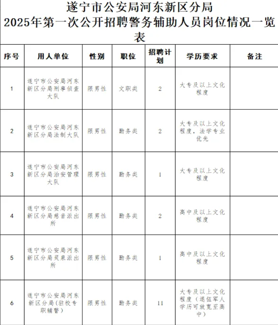 附件:1.遂宁市公安局河东新区分局2025年第一次公开招聘警务辅助人员岗位情况一览表