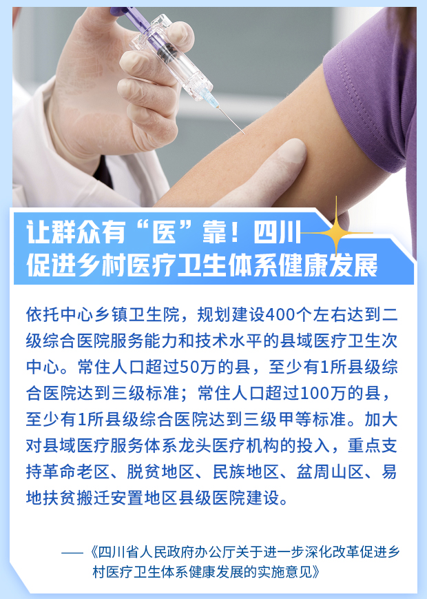 《意见》提出,将提高农村地区医疗卫生保障水平。省级财政统筹资金对健康四川示范县和县域医疗卫生次中心建设给予支持。市、县两级新增财力向乡村医疗卫生领域倾斜。加大对县域医疗服务体系龙头医疗机构的投入,重点支持革命老区、脱贫地区、民族地区、盆周山区、易地扶贫搬迁安置地区县级医院建设。