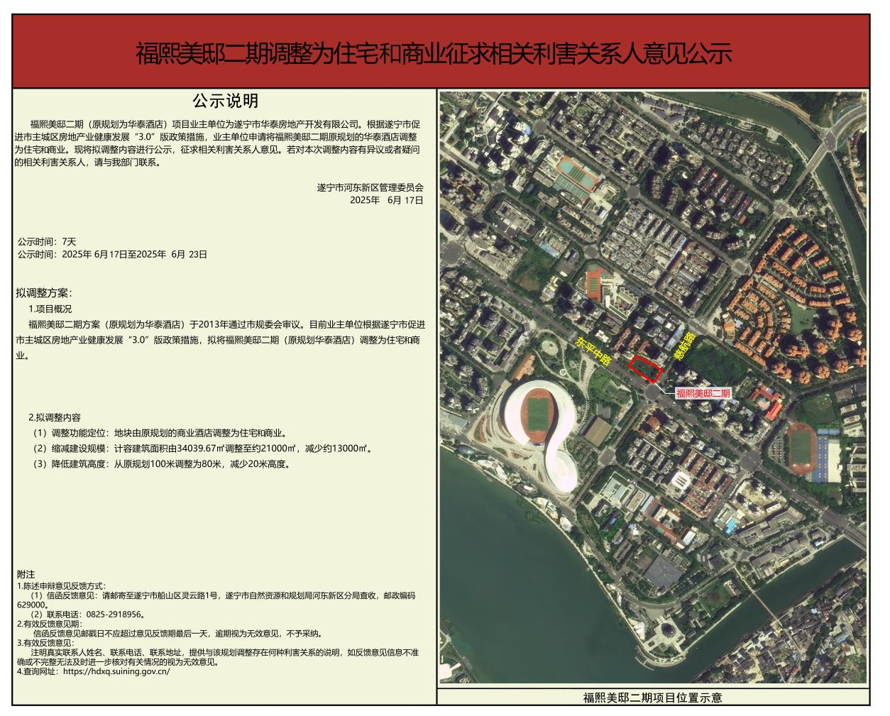 福熙美邸二期(原规划为华泰酒店)项目业主单位为遂宁市华泰房地产开发有限公司。根据遂宁市促进市主城区房地产业健康发展“3.0”版政策措施,业主单位申请将福熙美邸二期原规划的华泰酒店调整为住宅和商业。现将拟调整内容进行公示,征求相关利害关系人意见。若对本次调整内容有异议或者疑问的相关利害关系人,请与我部门联系。