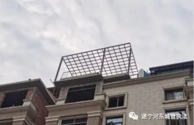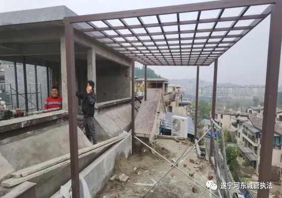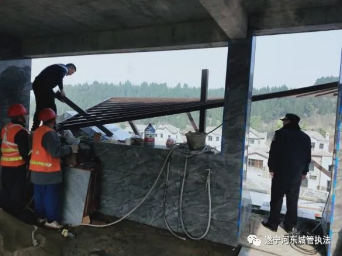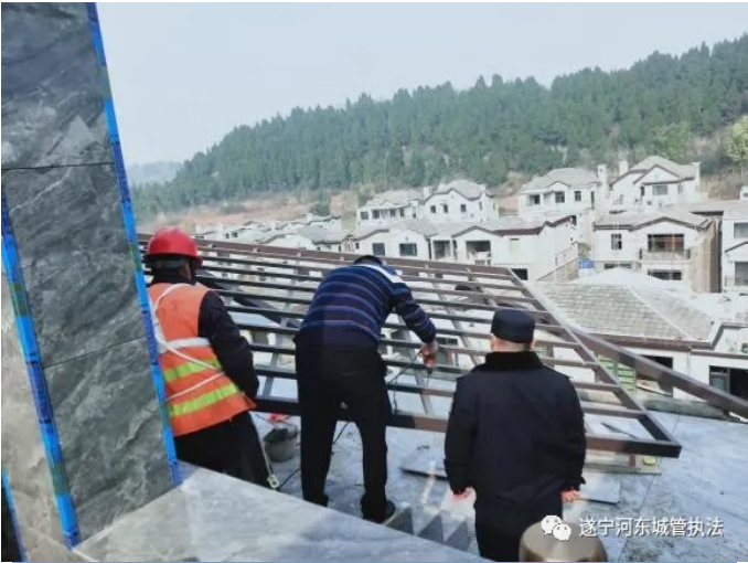 近日,综合行政执法局执法队员在巡查中发现保利养生谷某户私自在楼顶露台搭建钢架结构棚。经现场核查并比对该小区《居民公约》装饰装修管理规定,该处建设未按照制定的《居民公约》管理规范进行施工,且存在一定的安全隐患。执法人员当即责令施工人员停止施工,告知该业主其行为违反了《遂宁市城市管理条例》第三十一条之规定,并向其发放了整改通知书,要求限期拆除违法建设,该业主表示会自行安排工人进行拆除。