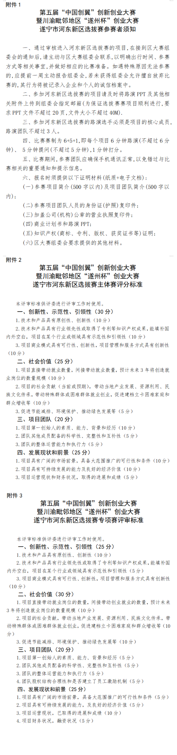 2.第五届“中国创翼”创业创新大赛暨川渝毗邻地区“遂州杯”创业大赛遂宁市河东新区选拔参专项赛评审标准。