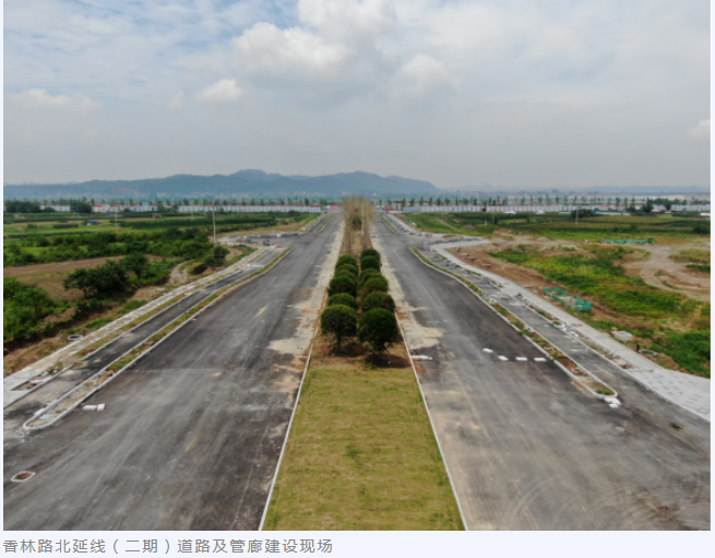 香林路北延线(二期)道路及管廊横跨河东二期,占地527.6亩,建设年限2019-2022年,主要建设长5735米,宽50米的市政道路(含道路、配套管廊、排水、照明、交通、绿化、海绵城市等工程)。目前,管廊主体完成60%,道路完成40%。
