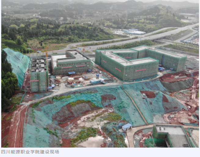 四川能源职业学院建设占地396亩,建设年限2021-2023年,主要建设:主教学楼、行政楼、科技楼、图书馆、田径场看台、体育馆、学生公寓、食堂、教师公寓、双创中心、实训楼、技术与交流中心、实训厂房等。目前,主体已完成100%,砌体已完成100%,正在进行装饰装修,预计8月中旬全面完工。