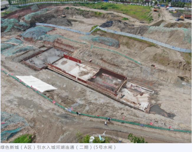 绿色新城(A区)引水入城河湖连通(二期)项目,总投资10.99亿元,主要建设6个水闸和配套用房,建设生态旅游、水生态系统养护工程、配套用房、水闸船闸等。目前正在进行船闸、5号水闸下部结构施工,准备启动2号泵站、水闸施工。
