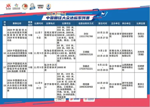 目前赛事正面向全国田径爱好者广泛公开招募,并于2024年10月19日正式发布了2024中国田径大众达标系列赛暨川渝大众田径公开赛竞赛规程,川渝大区赛即将于11月9日在遂宁体育中心开启,敬请关注。