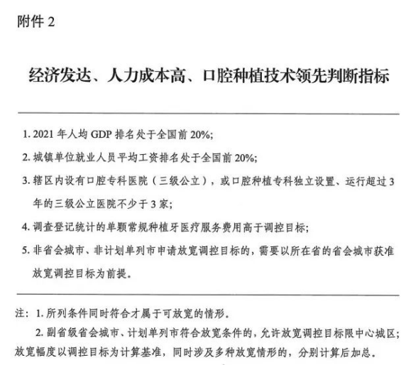 (二)严格把握符合放宽医疗服务价格整体调控目标的情形。对照《专项治理通知》要求,经济发达、人力成本高、口腔种植技术领先的地区可按照《操作要点》的具体指标(详见附件2)向省医疗保障局申请放宽调控目标,最高放宽幅度不超过10%。属于国家口腔医学中心或口腔种植专业列入国家临床重点专科的医疗机构可根据价格管理权限向医疗保障部门申请放宽10%。对于口腔种植成功率高、公开服务质量信息、承诺接受监督和检查的医疗机构,可根据价格管理权限向医疗保障部门申请放宽10%(相关受理事宜详见附件3)。同时涉及多种放宽情形的,分别计算后加总确定调控目标。放宽调控目标部分主要在种植体植入和牙冠置入两个项目的价格水平上体现。