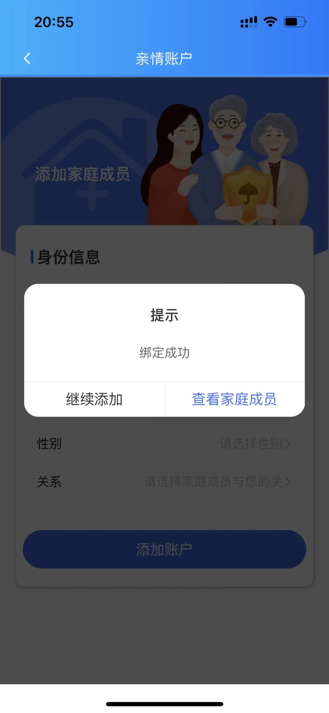 3. 填写绑定人身份信息,确认无误后,点击添加账户按钮,提交亲情账户绑定申请。