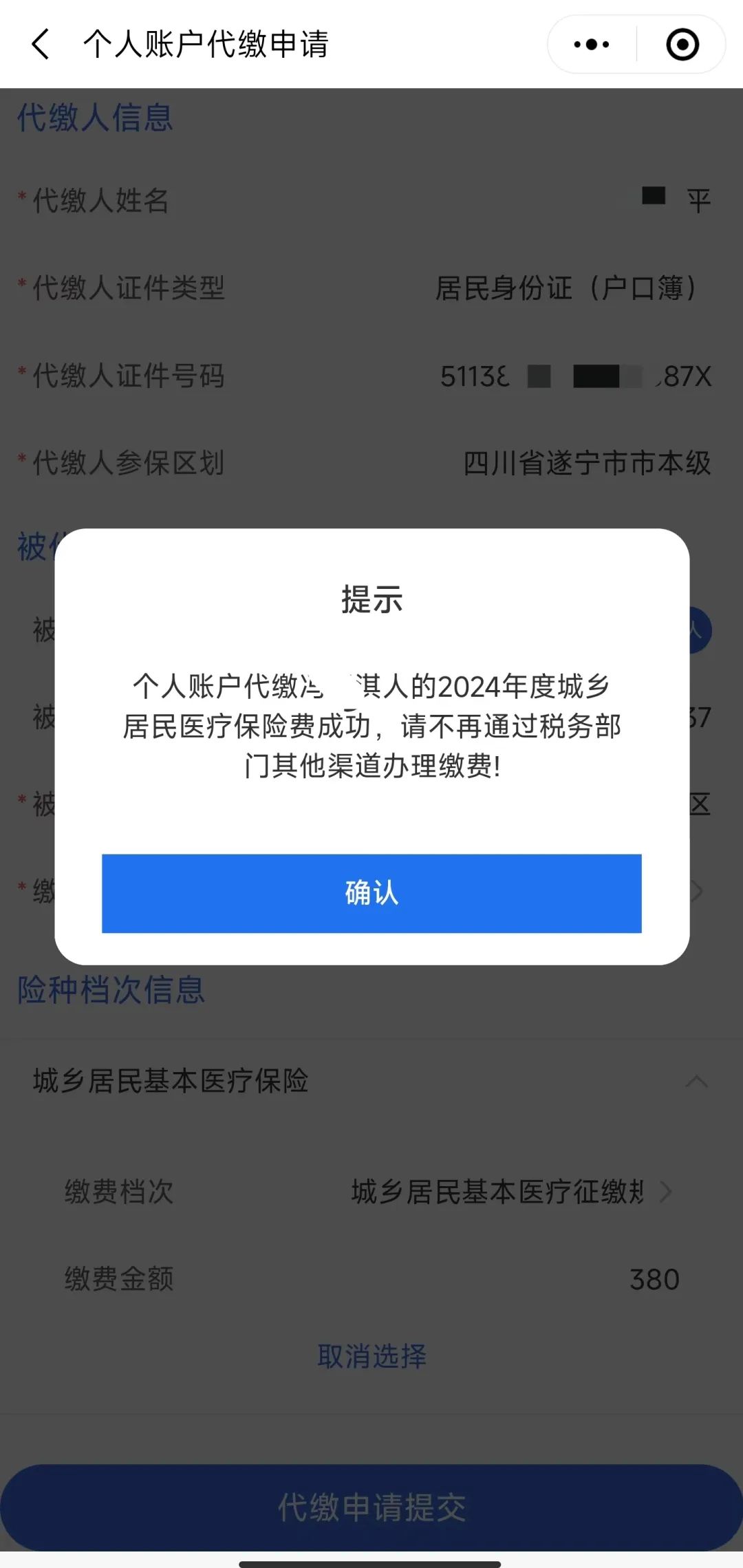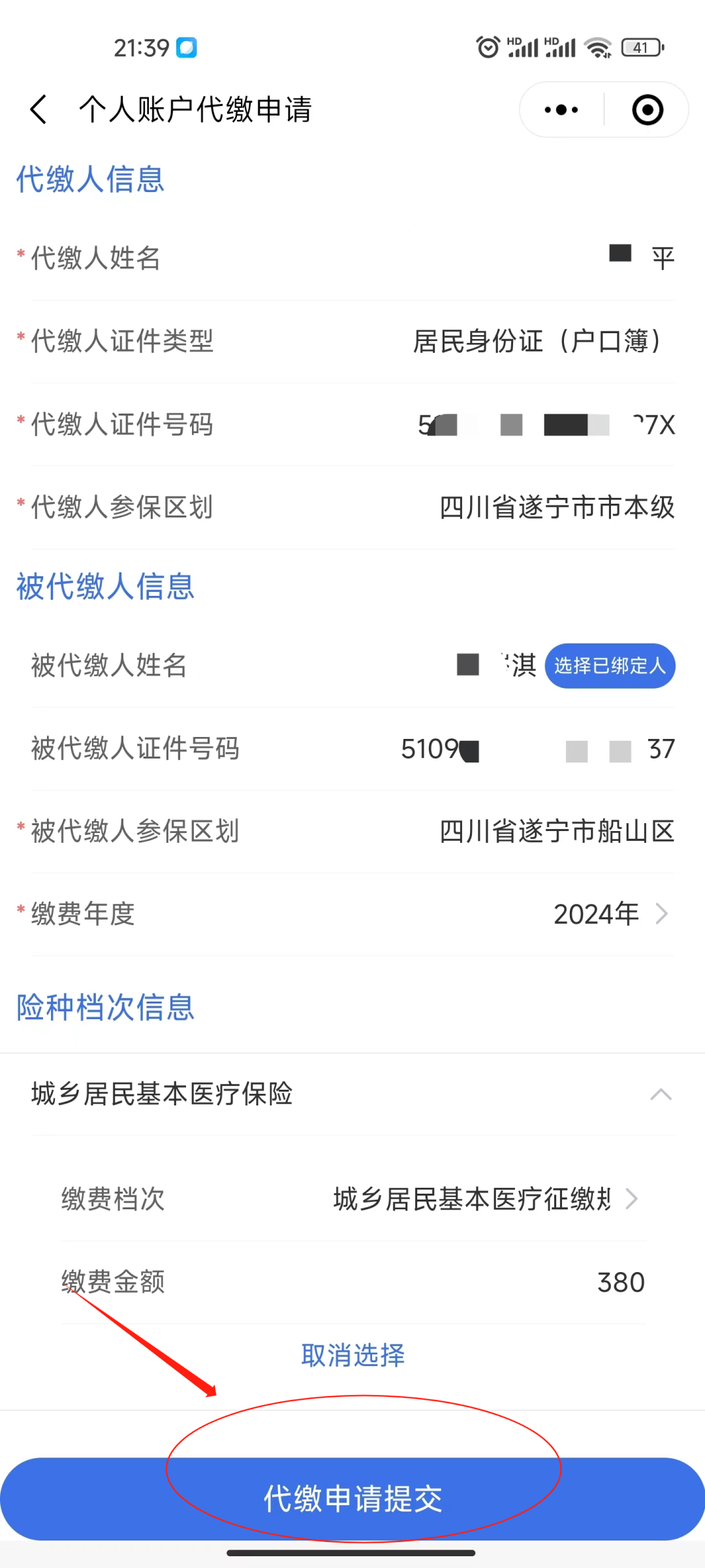 8. 确认提交信息无误,点击代缴申请提交按钮,提交申请,业务办理完成。