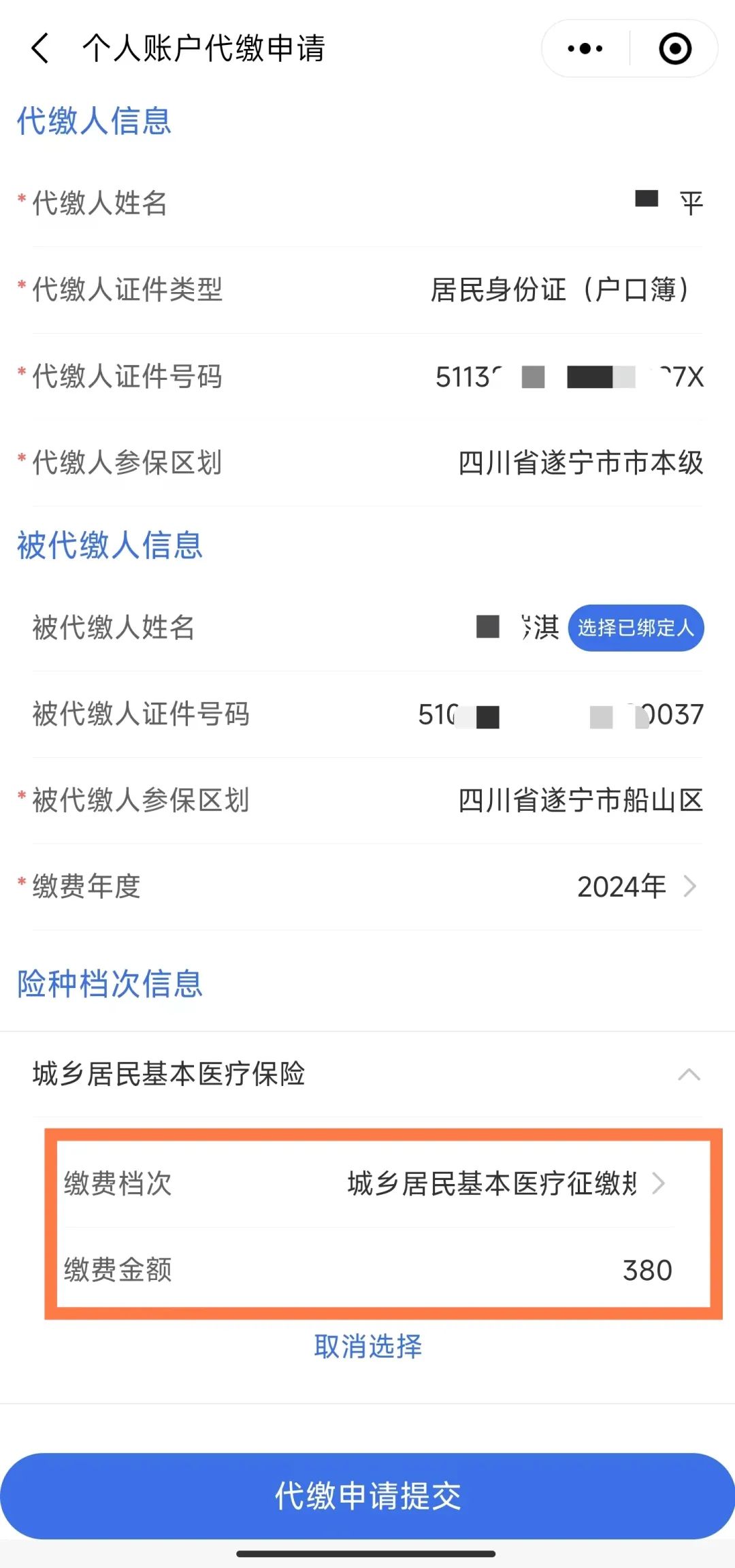 7. 个人账户代缴申请代缴信息核验通过,继续选择缴费险种、缴费档次、确定缴费金额。