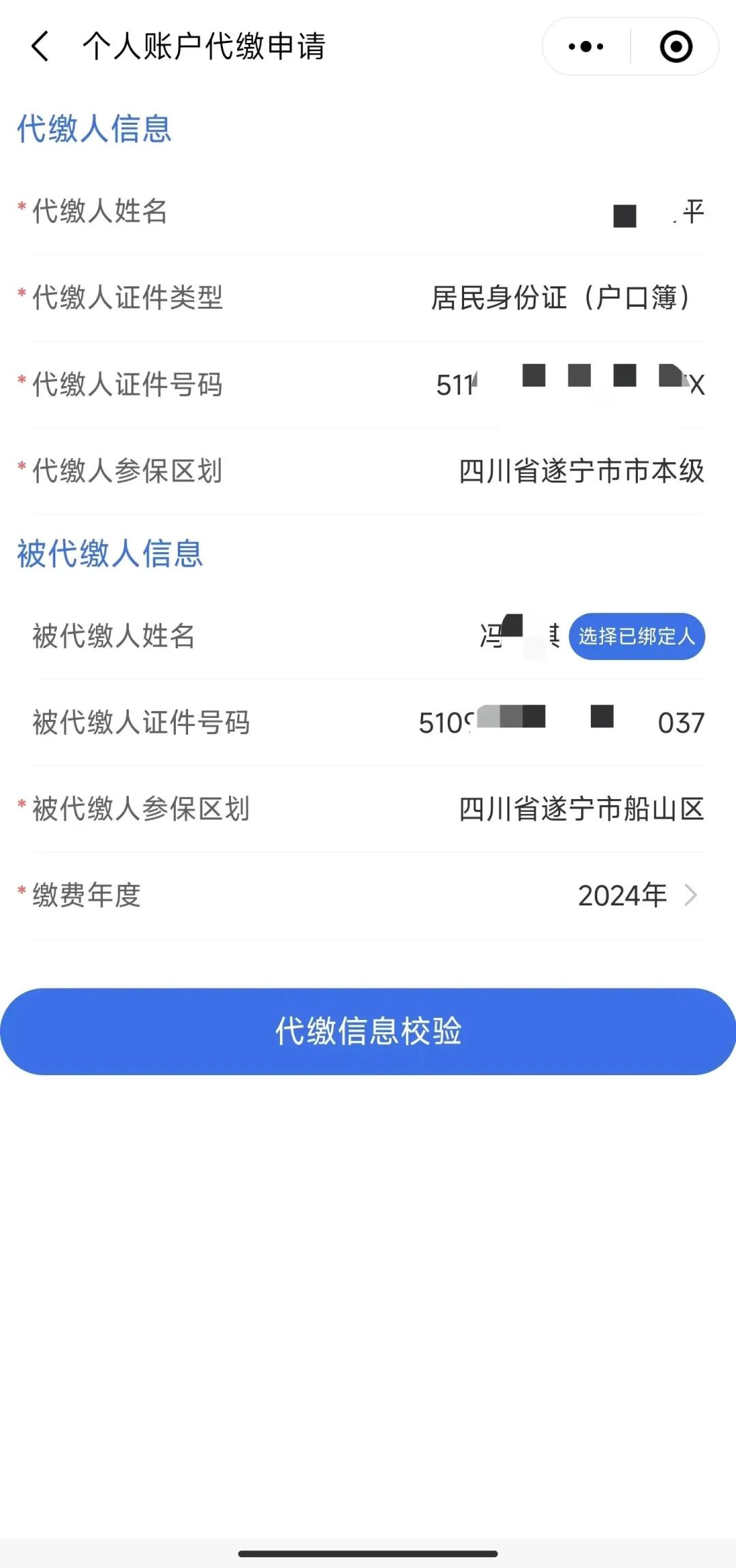 6. 进入个人账户代缴信息填写界面,确认代缴人信息,录入被代缴人姓名、身份证、参保区划和选择缴费年度,最后点击代缴信息校验按钮进行信息核验。