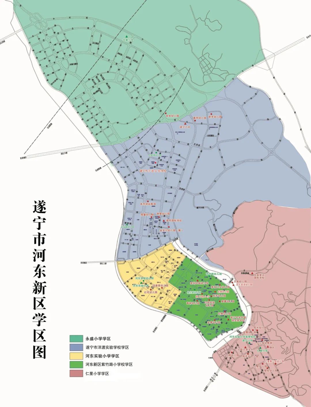 4.遂宁市河东新区紫竹路小学校(简称“紫竹路小学”)学区范围:灵云路西段至朝阳路东段以南,九宗书院路以北,芳洲路以西(慈音街道办棉场社区;灵泉街道办书院社区、灵应寺社区)。包含楼盘:金域峰景、魅力城、中央美邸、香林雅郡、翔宇桂苑、盛世华府、福熙美邸、学府馨城、东方明珠、书香美邸、遂州新城、龙腾·青年公社、灵应寺小区、新塘房小区、法院宿舍、君豪.春天大道、紫竹美庭、龙腾御景、遂宁大院、国玉金都、富民小区、柳莲小区、铂金公馆、世纪锦江、中央广场、尚城一期.馨苑、置信丽府等。