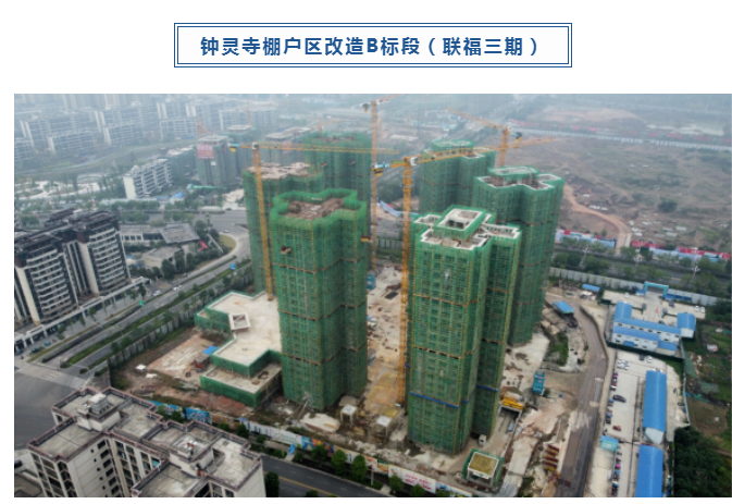 钟灵寺棚户区改造B标段(联福三期)项目占地41.7亩,建设年限为2020-2023年,总投资3.13亿元。主要建设内容为6栋居民楼和1栋商业用房、小区内道路、管网、景观、照明等配套工程。目前,项目主体已全面建成,砌体完成80%,安装施工完成10%。